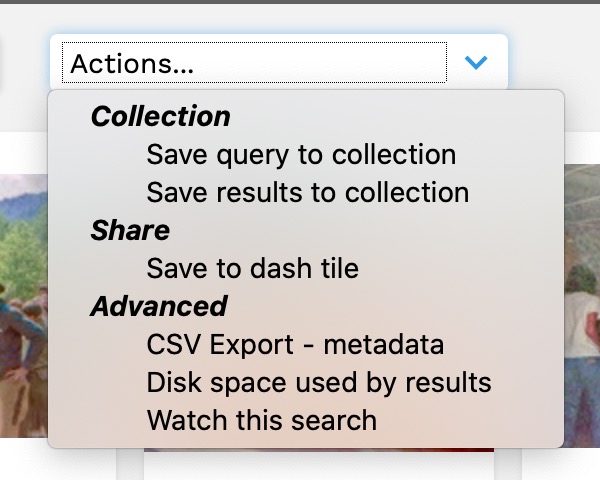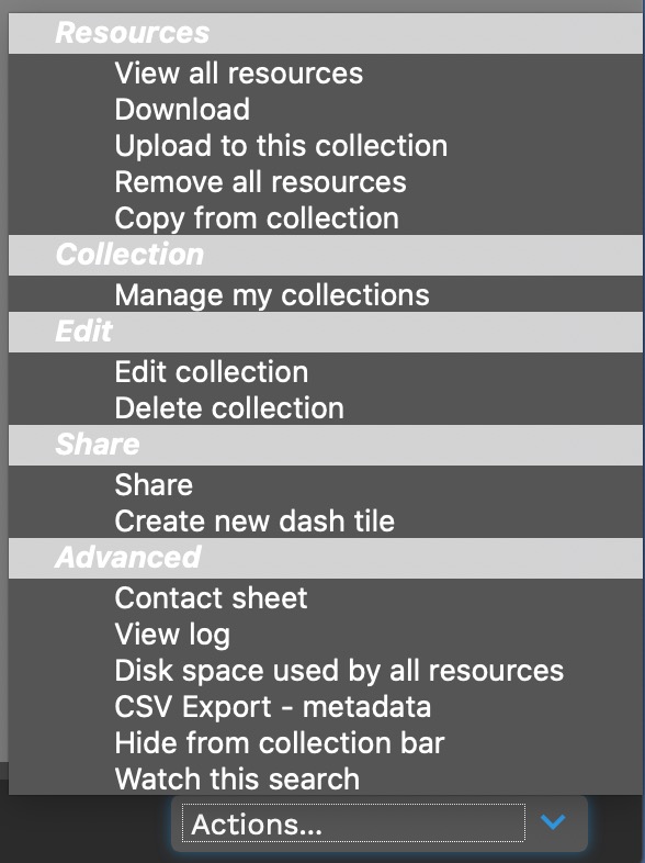 The Collections bar will display information about a collection whether or not its images are displayed in the window! It will show you the name of the “current” collection and how many items are in it. You can change collections without changing the images displayed in the window. The “Action” menu for Collections lets you execute actions on a Collection. If you want to display a Collection’s images in the browser window choose “View all resources”. Below are all the options.